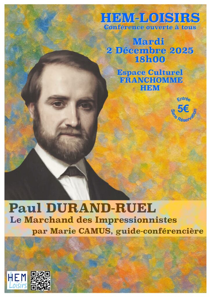 Pour comprendre la naissance de l’impressionnisme, il est essentiel de s’intéresser au monde de l’art et surtout à ses acteurs. Cette conférence permettra de présenter le rôle essentiel du marchand d’art et galériste Paul DURAND-RUEL (1831-1922). Plus qu’un pilier financier, Paul DURAND-RUEL fut aussi un ami fidèle et un mécène précieux de plusieurs artistes malgré les périodes difficiles.